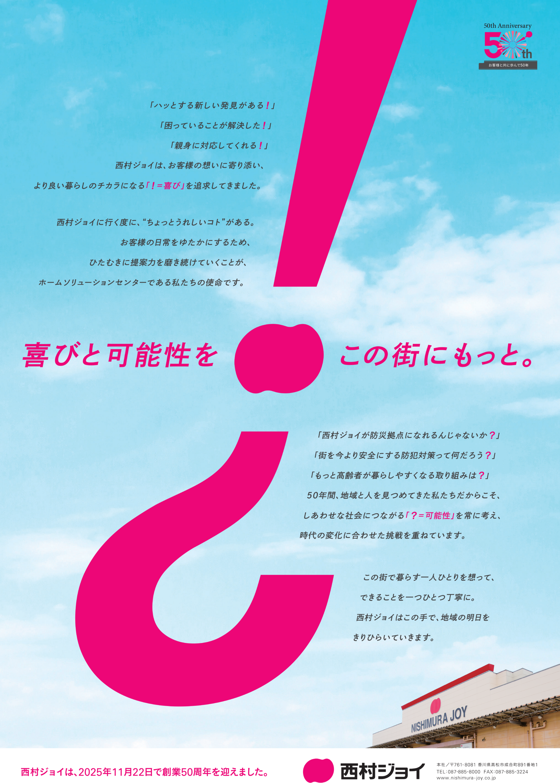 西村ジョイは、2025年11月22日で創業50周年を迎えました。
