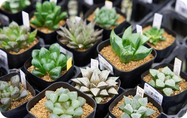 ジョイガーデンでは、観葉植物や多肉植物、庭木や芝刈り機まで、幅広いラインナップをご用意しています。「少量多品種」の植物展開や、サイズ・カラーの豊富な商品バリエーションも強みのひとつです。