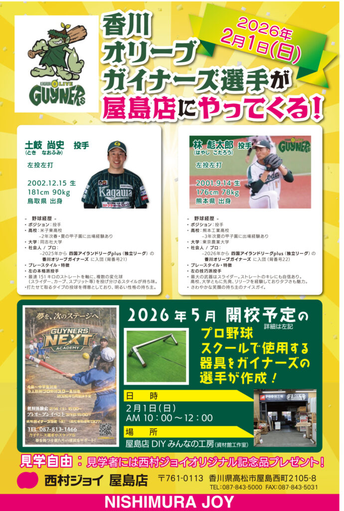 2026年1月27日 お知らせ 屋島店 香川オリーブガイナーズの選手が屋島店にやってくる Share 屋島店からの お・し・ら・せ 2月1日(日)香川オリーブガイナーズの選手が屋島店にやってきます🌈 香川オリーブガイナーズが2026年5月に開校するプロ野球スクール このスクールで使用する器具 こちらを単管パイプを使ってガイナーズの選手がDIYで作成します🛠️ 土岐尚史 選手 林 琥太郎 選手 屋島店資材館 みんなの工房(工作室)にて 午前10:00~ 作成スタート どなたでも見学できます👀 *見学者には、西村ジョイオリジナル記念品をプレゼント🎁 ぜひ、見に来てね✨