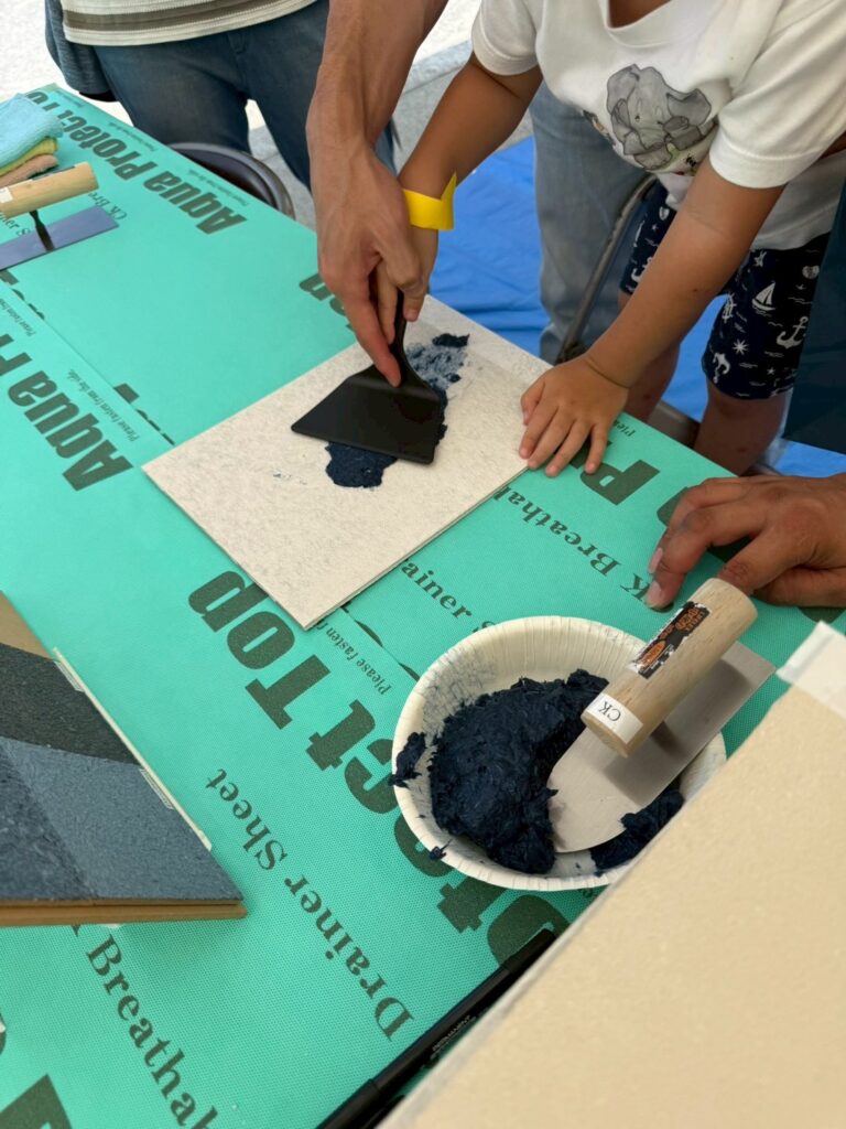 今回は【出張・外壁博士】として 本物の建築現場で使われているデニムの塗り壁を 使った左官体験を行います。