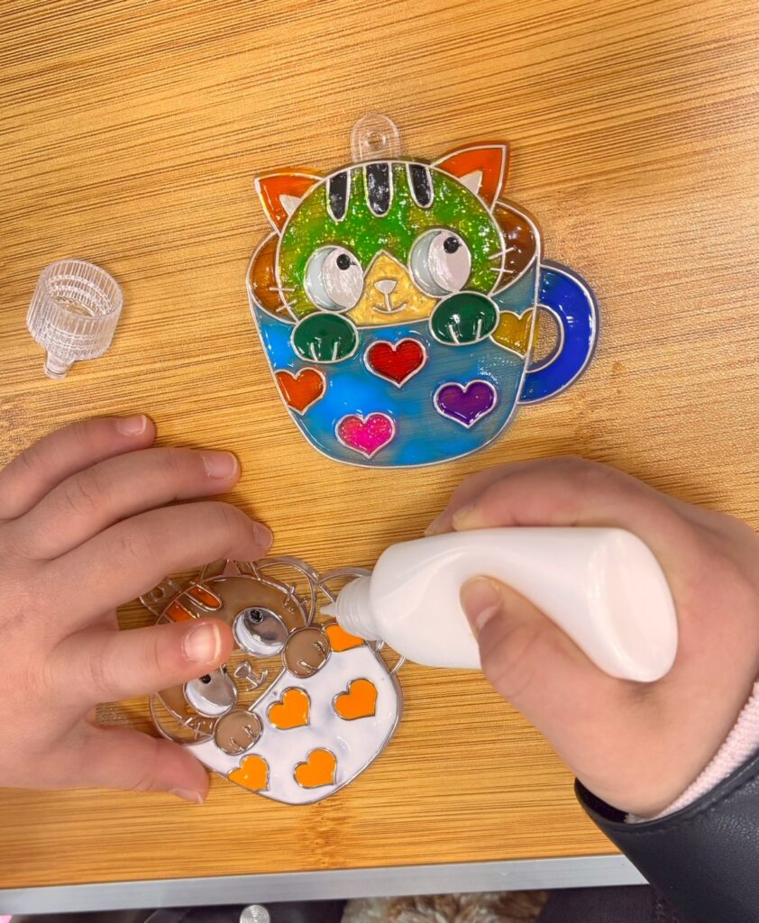 乾くと透明になるステンドグラスの様なキーホルダー、置き型アートのワークショップをしています。